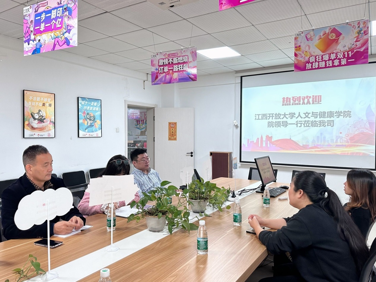 11月9日,江西开放大学人文与健康学院党委书记梅甜甜带领健康管理系负责人茅维亦、培训部干事胡启明一同赴江西仁和堂医药连锁有限公司进行访企拓岗相关工作。