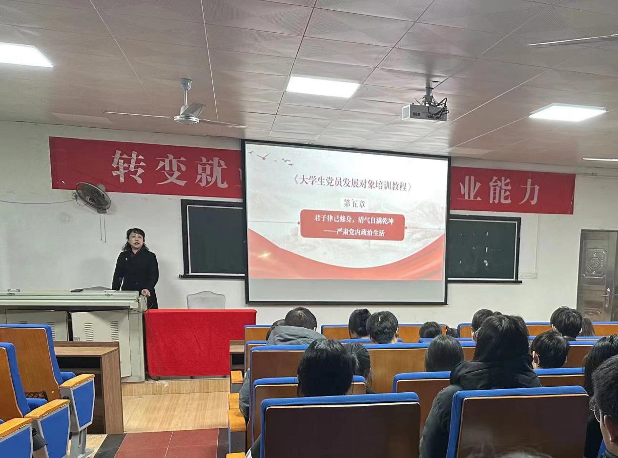 114日下午16:30,杨柳院长在1101教室为学院2023年第二批党员发展对象作《君子律己修身,清气自满乾坤——严肃党内政治生活》和《治国必先治党,治党务必从严——坚持全面从严治党》专题党课培训,全体发展对象参与学习。